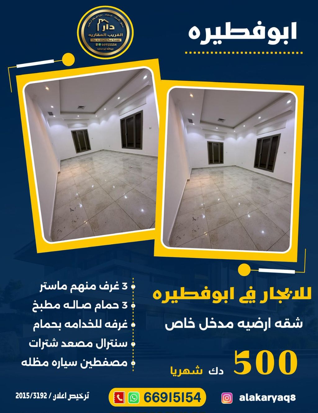For rent: A ground-floor apartment in Abu Fatira with a private entrance and a courtyard. It has 3 bedrooms including a master bedroom, a living room, 3 bathrooms, a fully equipped kitchen, a maid's room with a bathroom, central air conditioning, and parking for two cars. Rent: 500 Kuwaiti Dinars.