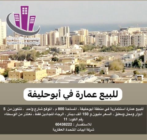 للبيع: عمارة استثمارية في منطقة أبو حليفة، بمساحة 800 متر مربع، تقع على شارع واحد. تتكون من 5 أدوار ومحل ومعلق. السعر مليون ومائة وخمسون ألف دينار. للجادين فقط، نعتذر من الوسطاء. رقم الكود 11 للاستفسار. شركة أبيات المتحدة العقارية.