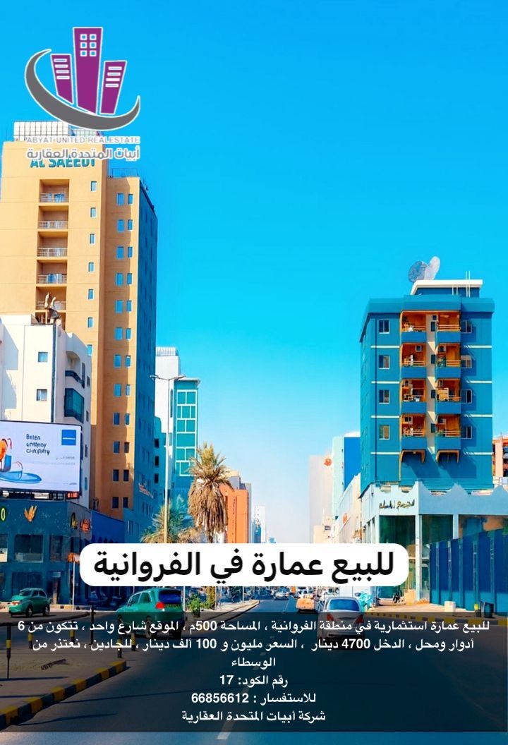 للبيع عمارة استثمارية في منطقة الفروانية، المساحة 500 متر مربع، الموقع شارع واحد، تتكون من 6 أدوار ومحل، الدخل 4700 دينار، السعر مليون و100 ألف دينار، الرجاء للجادين فقط، نعتذر من الوسطاء رقم الكود 17 للاستفسار شركة أبيات المتحدة العقارية