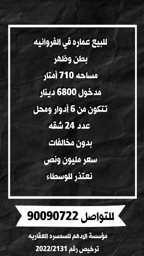 للبيع: عمارة في الفروانية، بطن وظهر، مساحة 710 متر مربع، مدخول 6800 دينار، تتكون من 6 أدوار ومحل، عدد 24 شقة، بدون مخالفات، سعر مليون ونصف. نعتذر للوسطاء. مؤسسة الأدهم للسمسرة العقارية، ترخيص رقم 2022/2131.