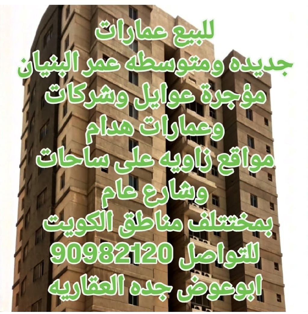 For sale: new and middle-aged buildings in the areas of Hawalli, Farwaniya, Mahboula, Abu Halifa, Al-Mangaf, and Fahaheel. Contact Abu Awad.