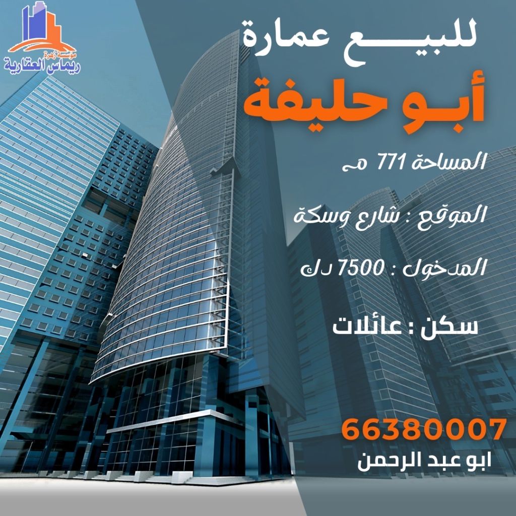 For sale: a building in Abu Halifa with 7 floors, area 772 square meters, located on a street and an alley, monthly income 7500.
