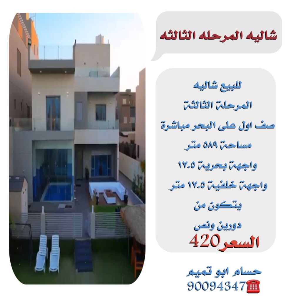 مباشرة في المرحلة الثالثة، الصف الأول مباشرة على البحر، مساحة 589 متر مربع، واجهة بحرية 17.5 متر واجهة خلفية 17.5 متر مع حديقة ومنطقتين للجلوس الخارجية ومسبح خاص. مفروش ومجهز بالكامل مزود بمصعد مجهز بشترات يتكون من دورين ونصف ويحتوي على 6 غرف منها 5 غرف ماستر، وصالتين ومطبخين رئيسي وتحضيري وغرفة صغيرة ماستر