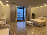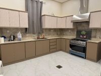 For rent A VIP chalet in Sabah Al Ahmad Sea City, Phase 5A for families. Super deluxe and elegant finishing, fully furnished, two and a half floors with an elevator. Includes on the ground floor a large living room with a guest bathroom and laundry area, one master bedroom, a swimming pool, a fully equipped kitchen, and a maid's room with a bathroom. The first floor contains 4 master bedrooms, each