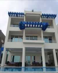 For families only. A modern chalet in Al-Khiran Park, Phase 3, directly on the creek. New furnishings. It consists of three and a half floors with an elevator, 10 rooms all master bedrooms, 5 living rooms, and 5 equipped kitchens. It has a swimming pool, children's play areas. Weekend rent: 550 KD. Eid holiday rent: 900 KD. There is a refundable deposit.
