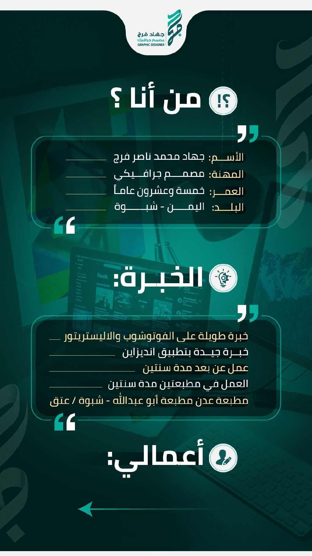 I am Jihad Muhammad, 25 years old, a graphic designer with 3 years of experience. I have worked in two printing houses and remotely for one year. I work on Photoshop and Illustrator with extensive experience in both, and I have basic knowledge of InDesign and Premiere. I can quickly learn new and modern things. I am looking for professional work, whether it involves relocation to a country or remote work, provided that the work does not contradict Islamic law, such as displaying images of women or promoting matters that oppose Islamic law.