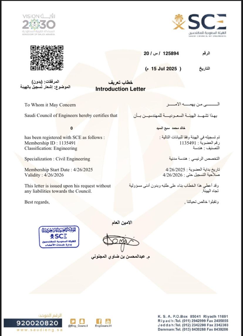 Civil engineer, technical office specialized in infrastructure, roads, and landscape works. Expert in shop drawings, proficient in quantity surveying, preparing payment applications, pricing work items, calculating quantities, planning, quality control, and handing over and receiving items. 6 years of experience, member of the Saudi Council of Engineers.