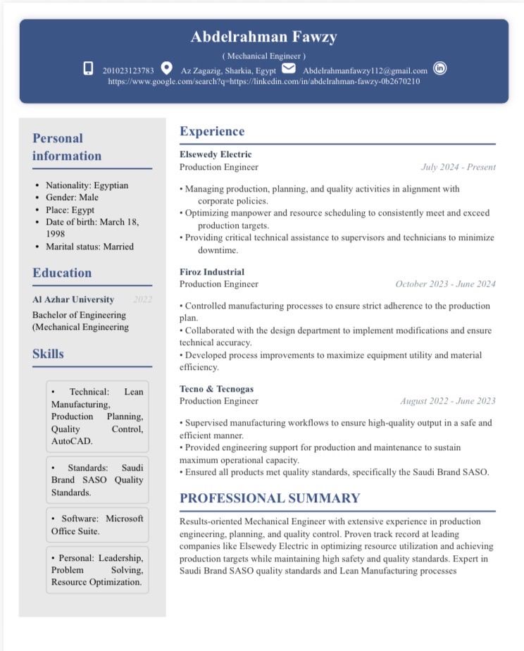 Mechanical Production Engineer with 4 years of experience, currently working at El Sewedy for Electric Transformers for over two years.