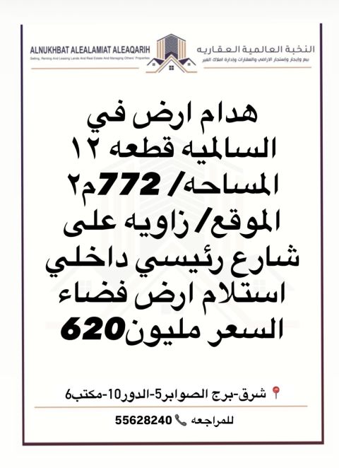 أرض للبيع في السالمية، قطعة 12. المساحة: 772 متر مربع. الموقع: زاوية على شارع رئيسي داخلي. الاستلام: أرض فضاء. السعر: 1,620,000.