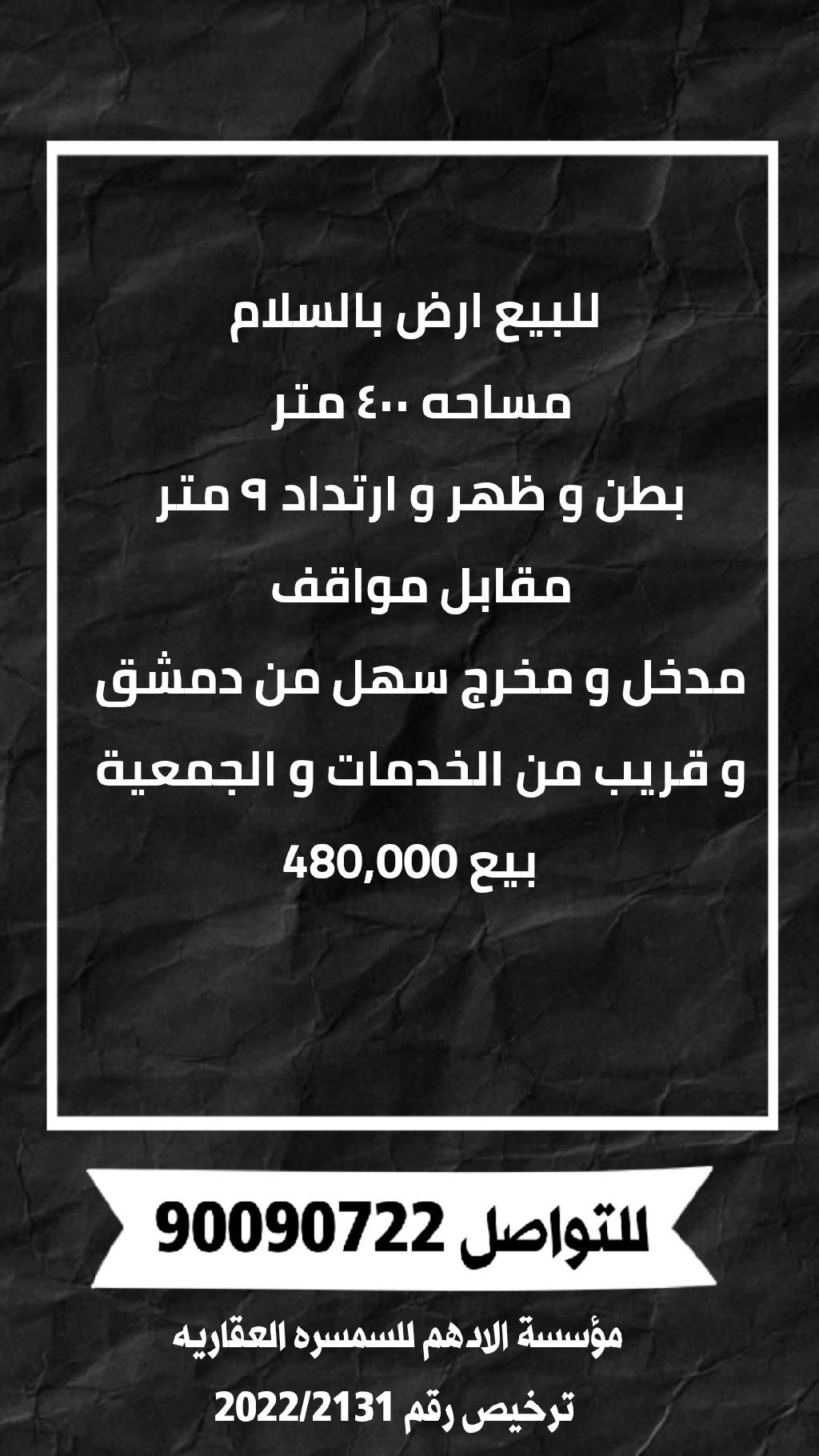 للبيع أرض في منطقة السلام بمساحة 400 متر مربع، بطن وظهر وارتداد 9 أمتار، مقابل مواقف سيارات، مدخل ومخرج سهل من دمشق، وقريبة من الخدمات والجمعية. رقم البيع