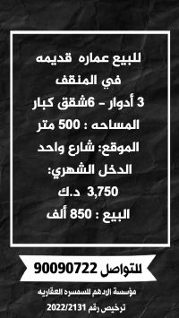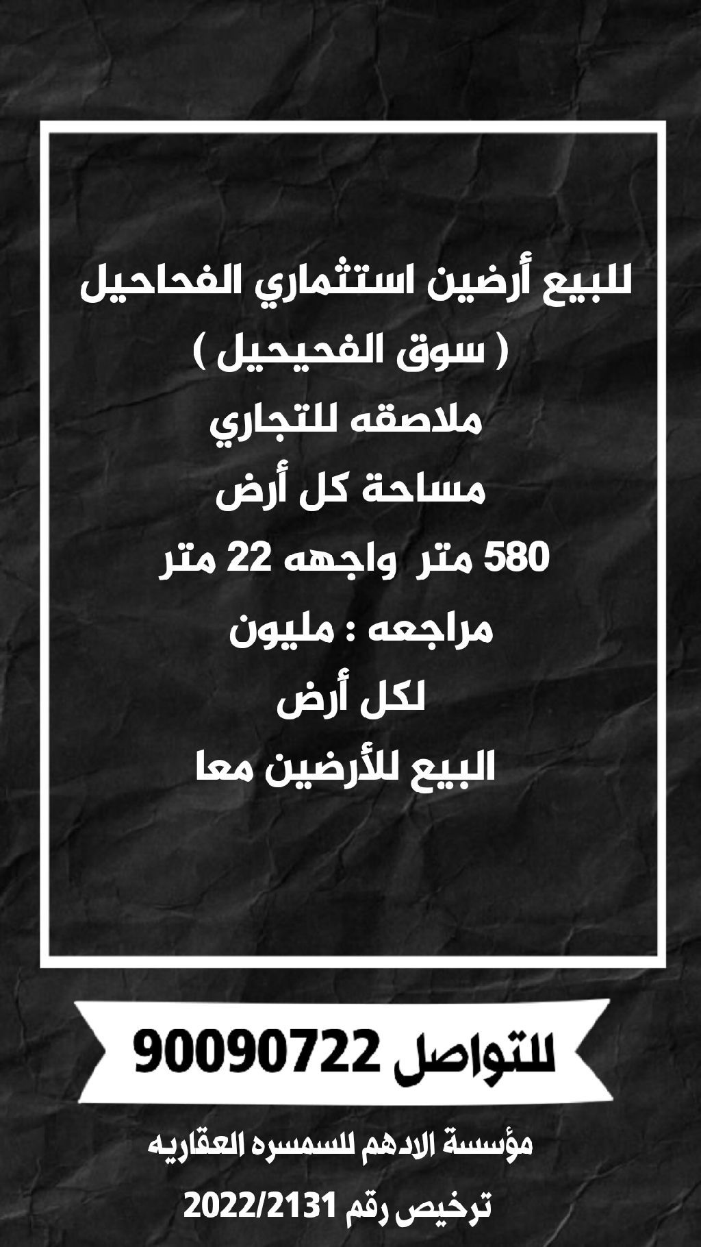 للبيع: أرضين استثماري في الفحيحيل (سوق الفحيحيل)، ملاصقة للمنطقة التجارية. مساحة كل أرض 580 متر مربع واجهة 22 متر. السعر: مليون لكل أرض. البيع للأرضين معاً.