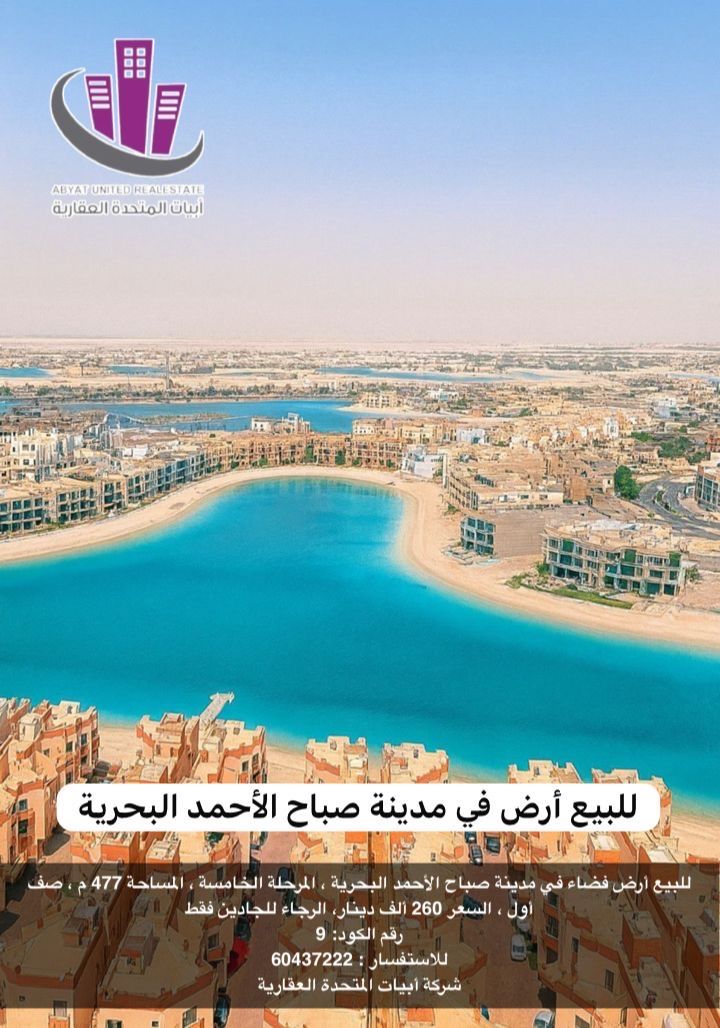 For sale, a vacant land in Sabah Al-Ahmad Sea City, Phase Five, area 477 square meters, first row, price 260 thousand dinars. For serious inquiries only, code number 9. For inquiries, contact Abyat Al-Muttahida Real Estate Company.