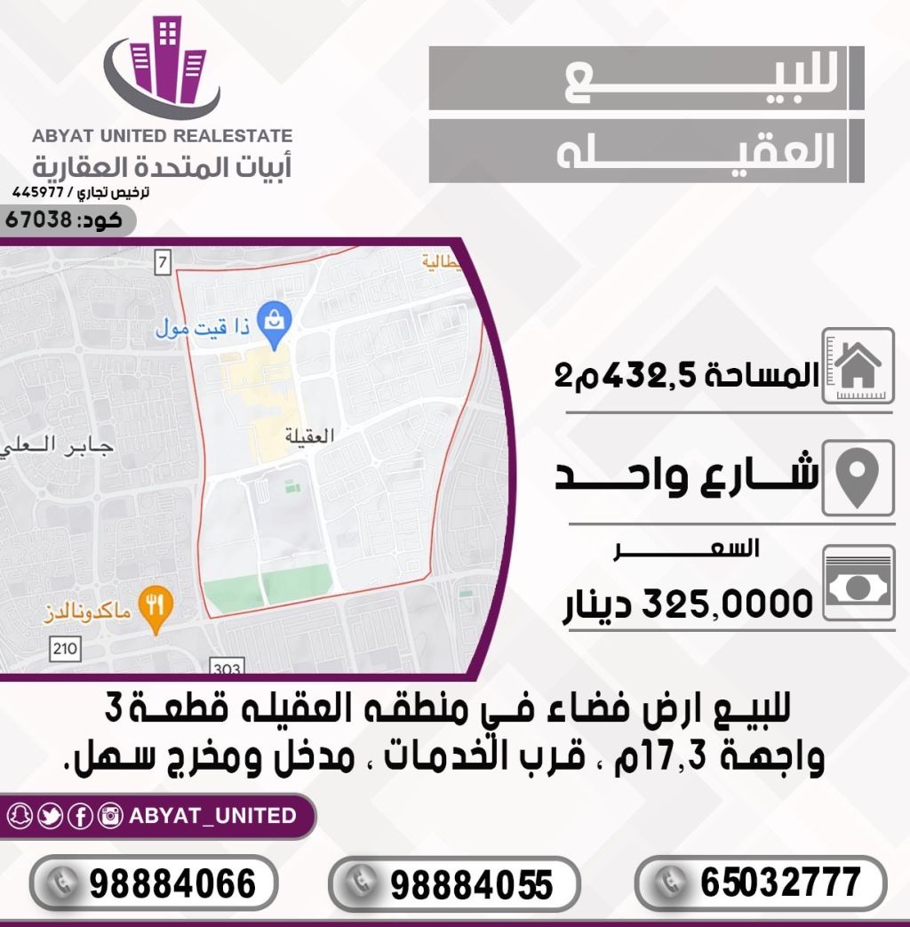 For sale: a vacant land in the Al-Aqeelah area, plot 3. Location: one street, area 432.5 m², frontage 17.3 m, near services, easy access. For inquiries, mobile 1, mobile 2, mobile 3 - price 325 thousand dinars - code number 67038.