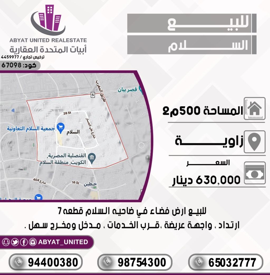 For sale, an empty plot in Al-Salam suburb, piece 7. The location is on a corner, area 500 sqm, with a setback, wide frontage, near services, easy access and exit. For inquiries, mobile 1, mobile 2, mobile 3 - Price 630 thousand dinars - Code number 67098.