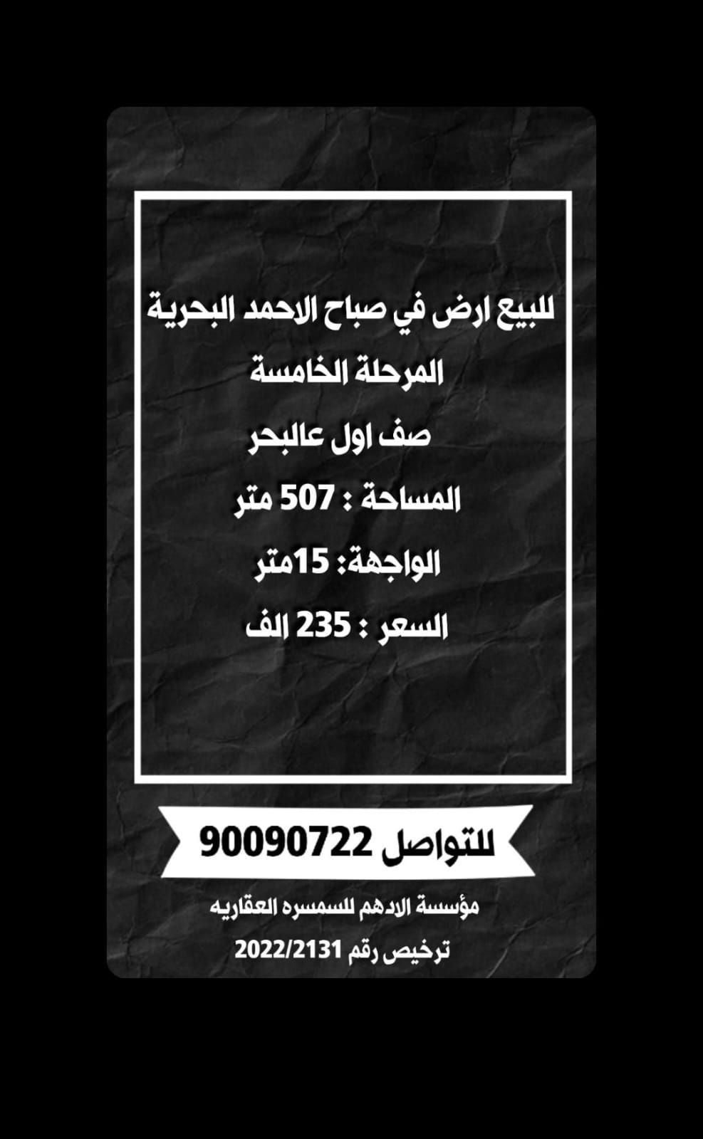 For sale, a land plot in Sabah Al-Ahmad Sea City, Phase Five, first row on the sea. Area: 507 square meters. Frontage: 15 meters. Price: 235,000 Kuwaiti Dinars. For contact, license number: 2022/2131.