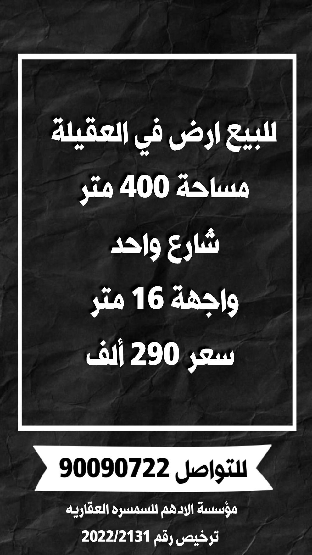 For sale, a land in Al-Aqila with an area of 400 square meters, one street frontage, 16 meters wide, price 290 thousand. For contact.