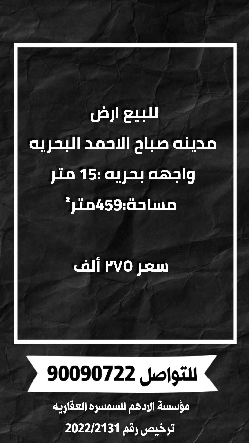 For sale, a land in Sabah Al-Ahmad Sea City with a 15-meter sea frontage, area 459 square meters, price 275 thousand. For contact.