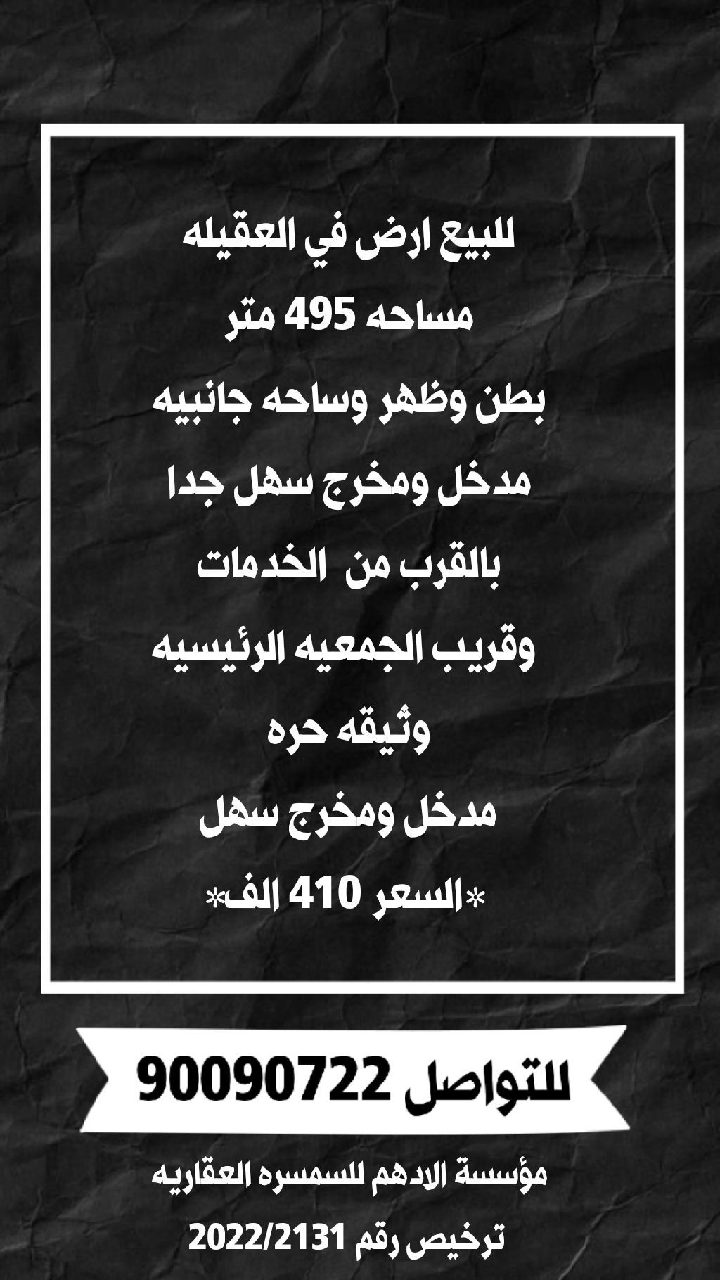 For sale, a land in Al-Aqeelah with an area of 495 meters, front and back, with side yards, easy entrance and exit, very close to services and near the main cooperative, freehold document, easy access, price 410 thousand.