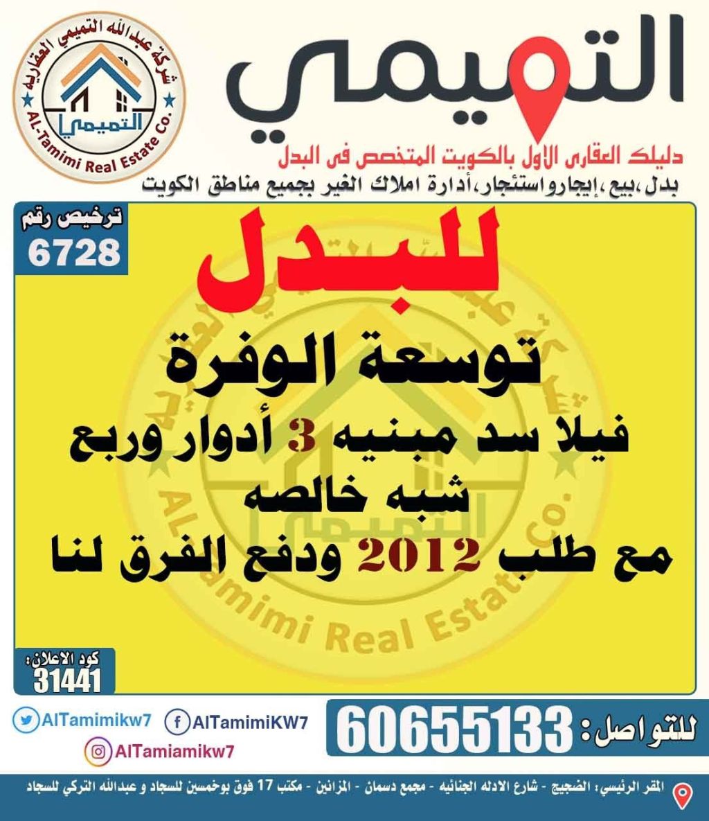 For exchange: a plot in Al-Wafra expansion, multi-story, with some deficiencies, requesting a 2012 or older model and paying the difference to us.