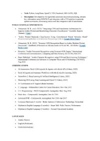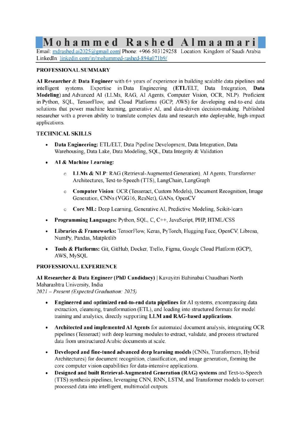 Specialist in Artificial Intelligence with over 6 years of experience in generative AI, intelligent agents, machine learning, and deep learning. Proficient in neural networks such as CNN, Transformers, GAN networks, and large language models (LLMs) for text and image processing, optical character recognition (OCR), and text-to-speech (TTS) conversion, with distinguished expertise in Arabic script processing and cloud solution deployment.