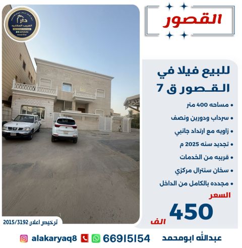 للبيع فيلا في القصور ق7 مساحة 400 متر، تشمل سرداب ودرين ونصف زاوية مع ارتداد جانبي. تم تجديدها سنة 2025م، قريبة من الخدمات، مع سنترال مركزي، مجددة بالكامل من الداخل. السعر: 450 ألف دينار كويتي.