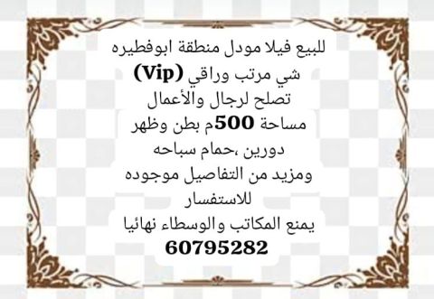 عرض حصري - للبيع فيلا مودل منطقة أبو فطيرة - مساحة 500م بطن وظهر - الفيلا عبارة عن دورين - حمام سباحة، كراج سيارة على باب شتر - الفيلا تصلح لرجال الأعمال ويناسب أصحاب الذوق - لمزيد من الاستفسار التواصل