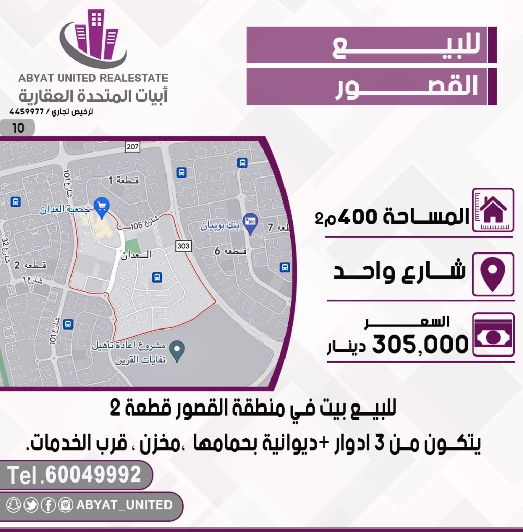 للبيع: بيت في منطقة القصور، قطعة 2، بمساحة 400 متر مربع. الموقع على شارع واحد. يتكون من 3 أدوار + ديوانية بحمامها، مخزن، وقرب الخدمات. للاستفسار، اتصل بالرقم النقال 1. السعر: 305 ألف دينار.
