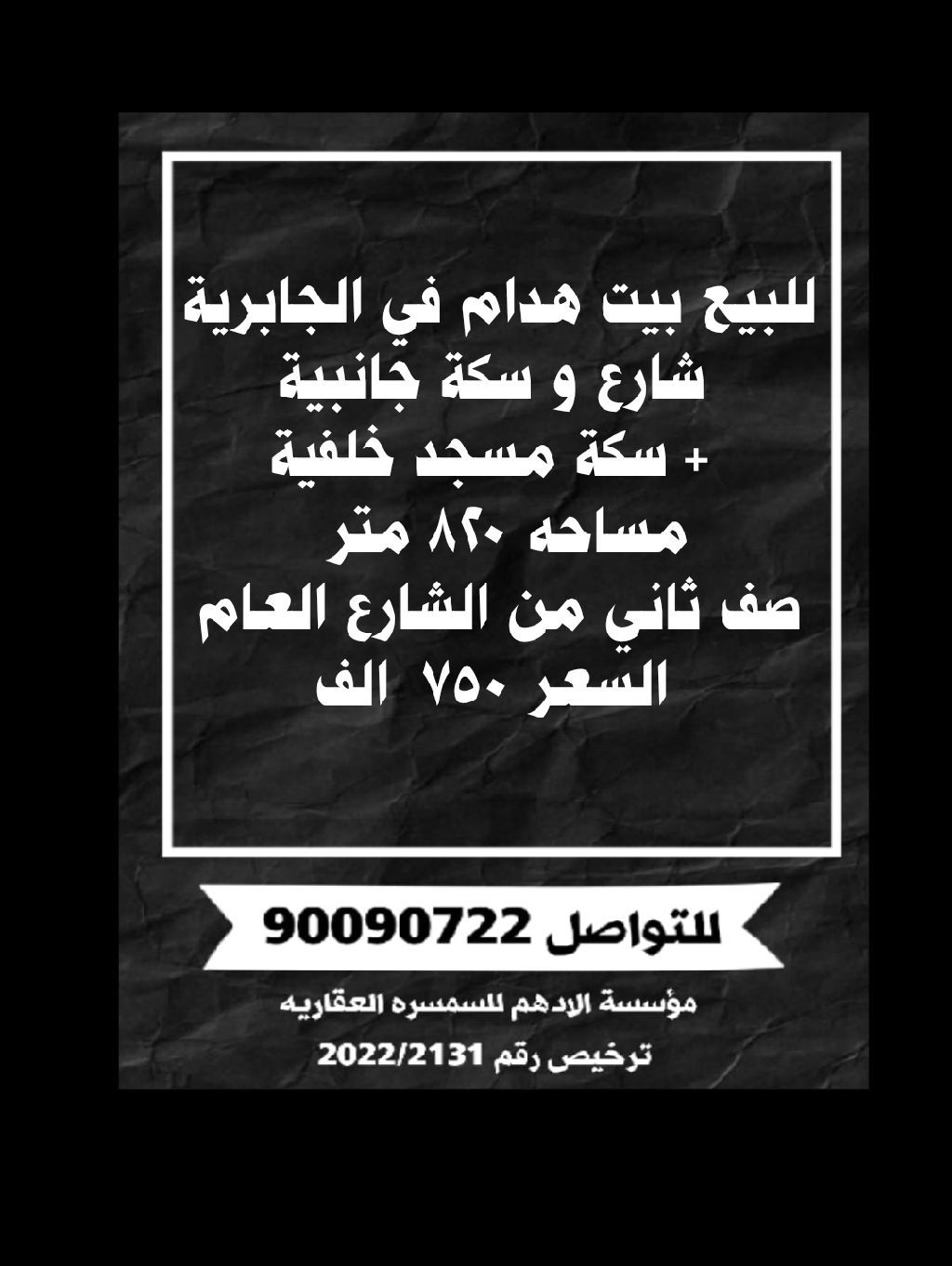 للبيع: بيت هدام في الجابرية، على شارع جانبي وسكة جانبية، مع سكة مسجد خلفية. المساحة: 820 متر مربع، صف ثاني من الشارع العام. السعر: 750,000.