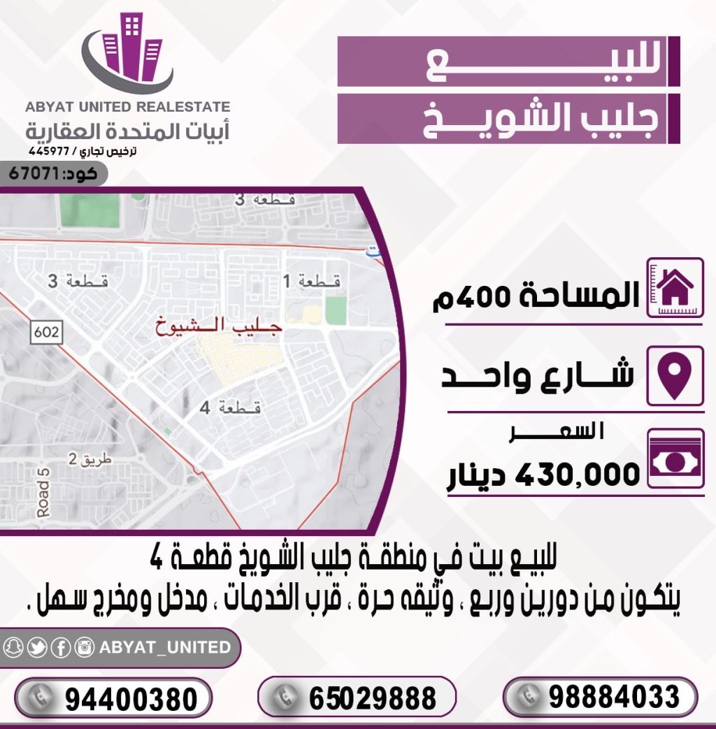 للبيع: بيت في منطقة جليب الشويخ، قطعة 4، بمساحة 400 متر مربع. الموقع على شارع واحد، يتكون من دورين وربع، وثيقة حرة، قرب الخدمات، ومدخل ومخرج سهل. للاستفسار، اتصل على النقال 1، النقال 2، النقال 3. السعر: 430 ألف دينار. رقم الكود: 67071.
