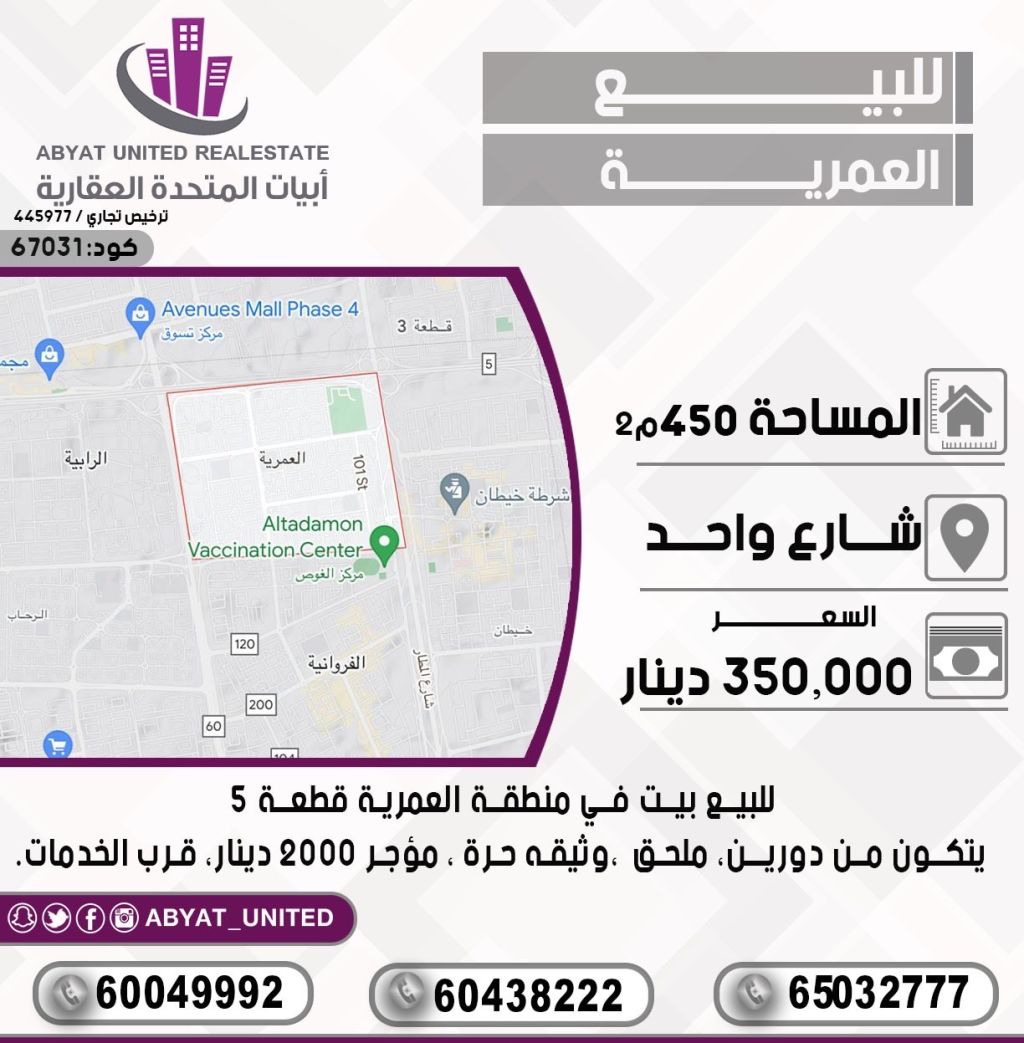 For sale: A house in the Al-Amiriya area, Plot 5. Location: One street. Area: 450 square meters. It consists of two floors, an annex, freehold document, rented for 2000 dinars, near services. For inquiries: Mobile 1, Mobile 2, Mobile 3. Price: 350,000 dinars. Code number: 67031.