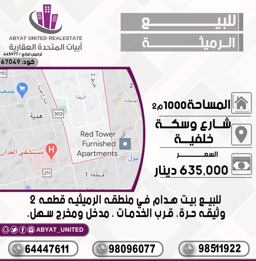 For sale: A demolished house in the Rumaythiya area, plot 2, area 1000 square meters, location with a street and back alley, freehold document, near services, easy access and exit. For inquiries, mobile 1, mobile 2, mobile 3 - Price 635 thousand dinars - Code number 67049