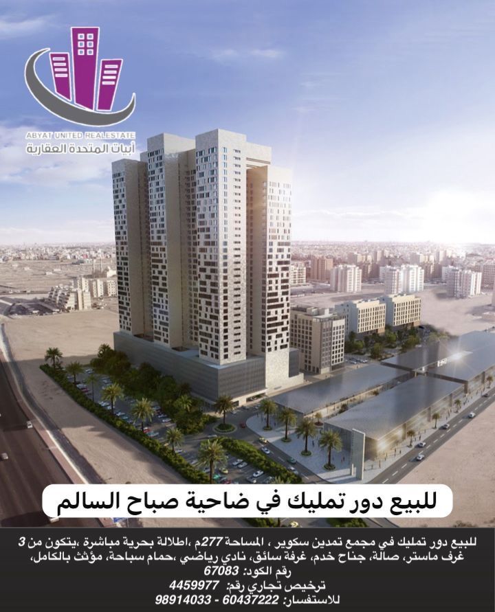 For sale A fully owned property unit in the Tamdeen Square complex in the Sabah Al Salem suburb. Area 277 SQM. Direct sea view. Consists of 3 master bedrooms, a living room, a maid's room, a driver's room, a gym, a swimming pool, fully furnished. Freehold document, code number 67083, commercial license number 4459977. For inquiries - United Abiat real estate Company