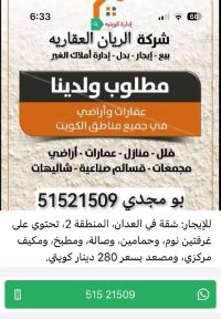 For rent, a house in Ali Sabah Al-Salem, Block 4. It consists of two entrances to the house + an island opposite the house, a courtyard + a diwaniya with a bathroom and laundry area + a large living room + a bathroom serving the living room + a storage room + a fully equipped kitchen + a rear courtyard + installed air conditioning units + laundry rooms. The first floor has four rooms, one of which is a master bedroom. Rent is 900 inclusive.