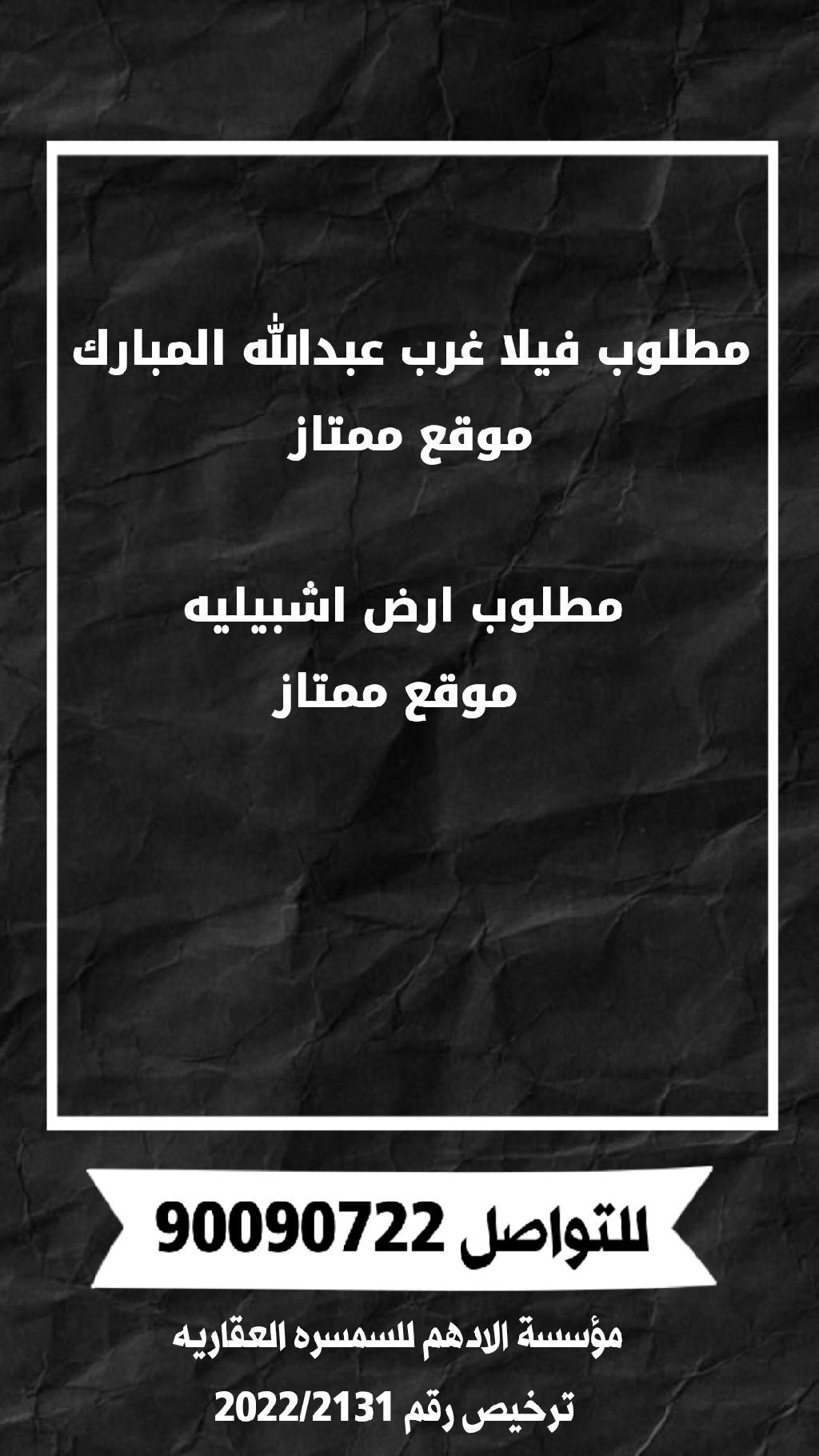 A villa is required in West Abdullah Al-Mubarak Al-Sabah, excellent location. Land is required in Ishbiliya, location.