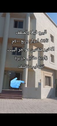 للبيع فيلا في المنقف مكونة من 3 أدوار، الدور الأخير به شقتان مؤجر تان لشركة كورية بمبلغ 3000 دينار كويتي شهريا. تحتوي على مصعد، تكييف مركزي، وشترات. المساحة 400 متر مربع، موقع زاوية، مقابل ساحة بناء، وهي نظيفة