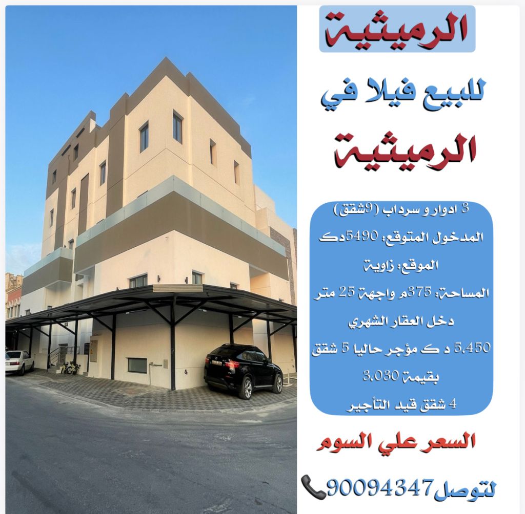 عرض مباشر للبيع: فيلا في الرميثية، 3 أدوار وسرداب (9 شقق). الدخل المتوقع 5490 دينار كويتي. موقع زاوية، المساحة 375 متر مربع، الواجهة 25 متر. الدخل الشهري للعقار 5450 دينار كويتي. مؤجر حالياً 5 شقق بقيمة 3030 دينار كويتي، و4 شقق قيد التأجير.