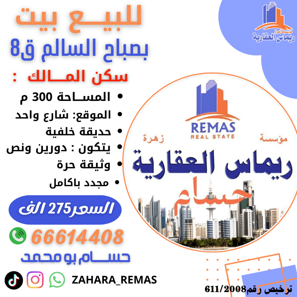 للبيع: بيت مجدد بالكامل في صباح السالم، قطعة 8. المساحة 300 متر مربع، مع شارع واحد وحديقة في الخلف بارتداد 8 أمتار. يتكون من دورين ونصف، وثيقة حرة، حديقة خلفية 15 متر في 9 متر، ونافذة خلف الحديقة. ترميم جديد. السعر: 275,000 دينار كويتي.
