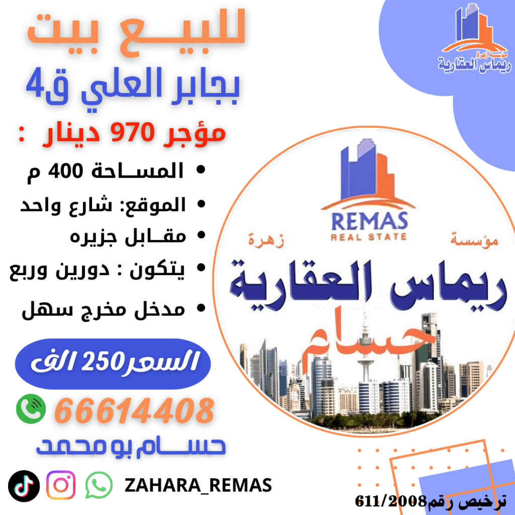 للبيع: بيت حكومي في جابر العلي، قطعة 4، بمساحة 400 متر مربع. وهو مؤجر بالكامل بمبلغ 970 دينار. يتكون البيت من دورين منفصلين وربع. الموقع على شارع واحد مقابل جزيرة 6، مع 6 مواقف سيارات، منها 2 مزودة بمظلات في الجزيرة. السعر 250,000 دينار.