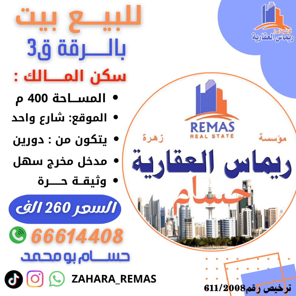 للبيع: بيت في الرقة، ق3، سكن المالك سابقاً. المساحة 400 متر مربع. الموقع على شارع واحد مع مدخل ومخرج سهل. يتكون من دورين. وثيقة حرة. السعر 260,000 دينار كويتي.