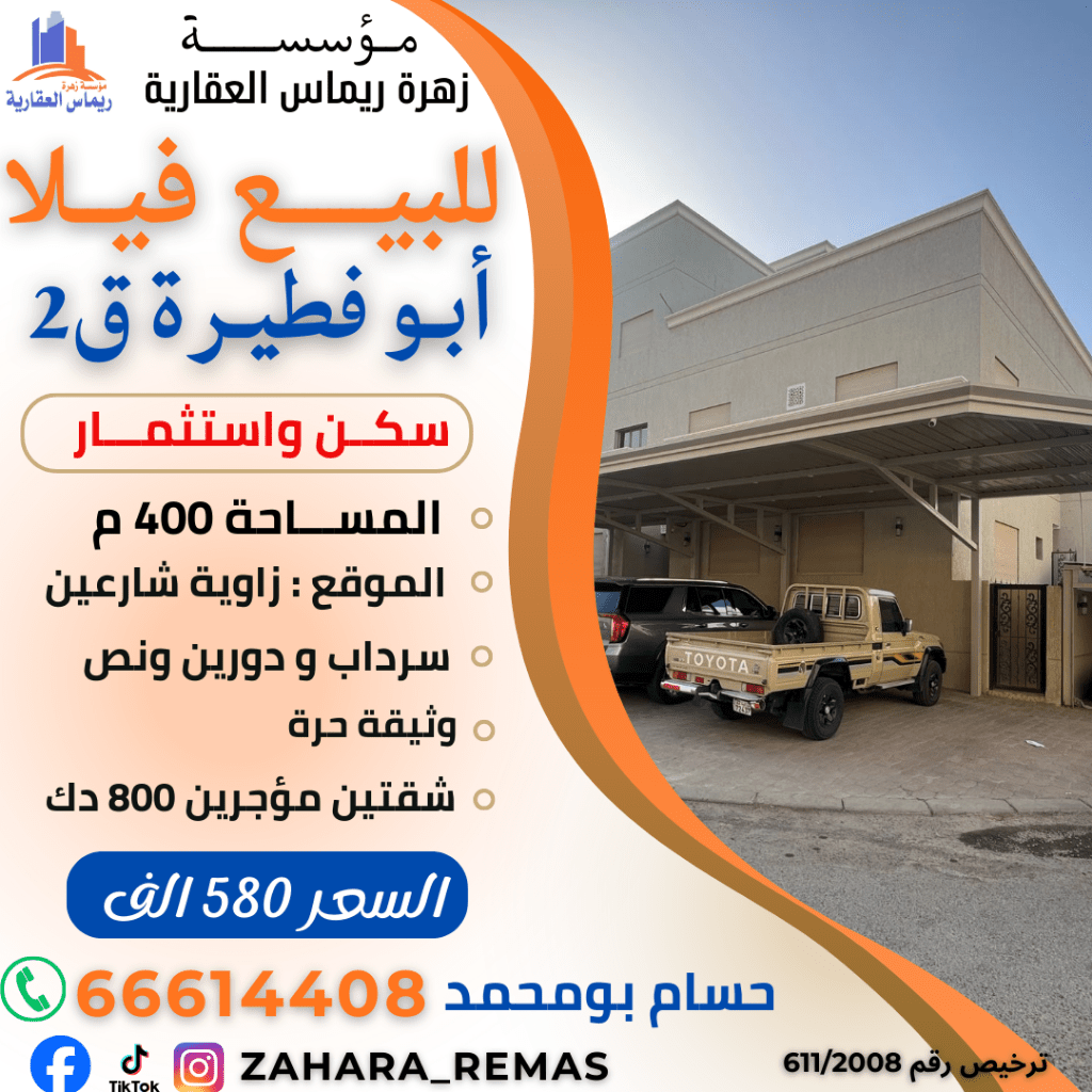 للبيع فيلا في أبو فطيرة ق2، المساحة 400 متر مربع، الموقع زاوية شارعين وارتداد 13 متر، مدخل ومخرج سهل قريبة من الجمعية، تتكون من سرداب ودورين ونصف سكن المالك وفيه شقتين مؤجرتين بـ 800 دينار، السعر 580 ألف دينار.