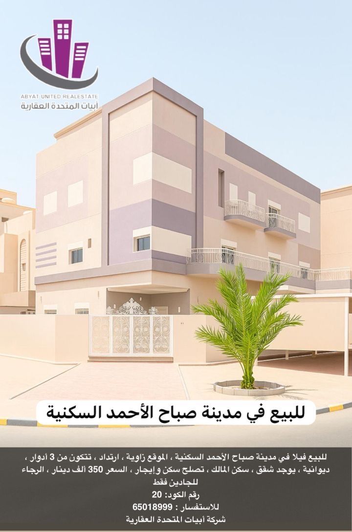 للبيع فيلا في مدينة صباح الأحمد السكنية، موقع زاوية، مع ارتداد، تتكون من 3 أدوار، ديوانية، تحتوي على شقق، سكن المالك، تصلح للسكن أو الإيجار. السعر: 350 ألف دينار. للجادين فقط، رقم الكود 20 للاستفسار، شركة أبيات المتحدة العقارية.