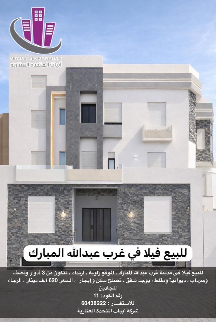 للبيع فيلا في مدينة غرب عبدالله المبارك الصباح، الموقع زاوية مع ارتداد، تتكون من 3 أدوار ونصف وسرداب، ديوانية ومقلط، يوجد شقق، تصلح للسكن والإيجار، تشطيب سوبر ديلوكس، السعر 620 ألف دينار، للجادين رقم الكود 11، للاستفسار ترخيص تجاري / 4459977 شركة أبيات المتحدة العقارية