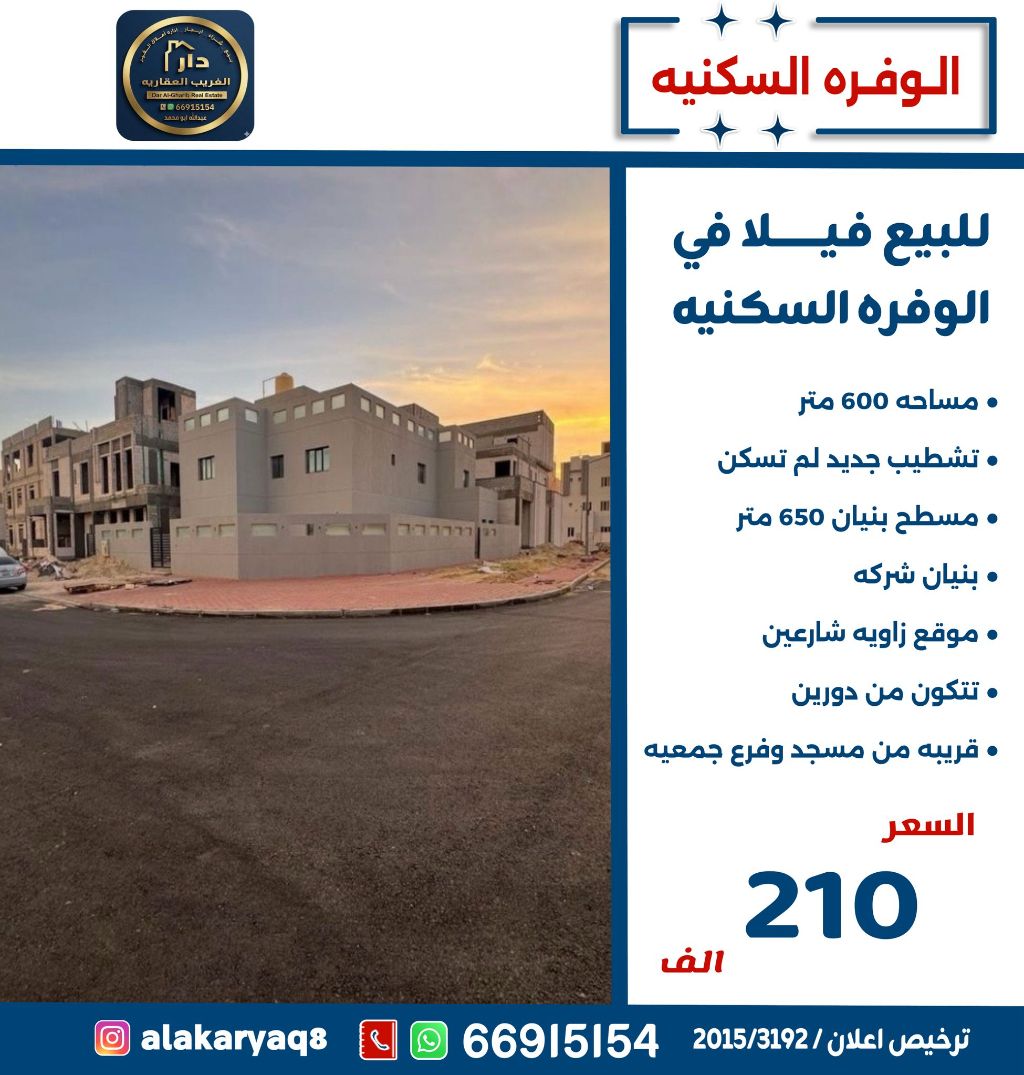 للبيع فيلا في الوفرة السكنية مساحة 600 متر مربع مكونة من دورين، مسطح البناء 650 متر مربع، زاوية شارعين، تشطيب جديد، لم تسكن، بنيان شركة، قريب من مسجد وفرع جمعية. السعر: 210 ألف دينار كويتي.