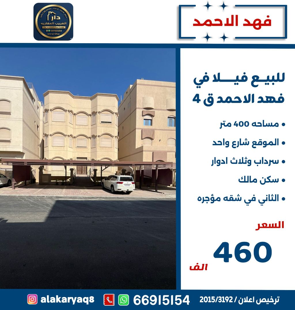 للبيع فيلا في فهد الأحمد ق4 مساحة 400 متر، شارع واحد، سرداب وثلاث أدوار سكنية. المالك يسكن في الدور الثاني في شقة مؤجرة. السعر: 460 ألف دينار كويتي.