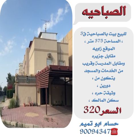 للبيع بيت في الصباحية، بمساحة 375 متراً مربعاً، يقع في موقع زاوية مقابل الجزيرة والمدرسة، قريب من الخدمات والمسجد. يتكون من دورين، وثيقة حرة، وكان سكن المالك. السعر 330,000 دينار كويتي