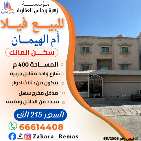 للبيع: فيلا دورين في الظهر، على شارع واحد. سكن المالك ووثيقة حرة. السعر: 170 ألف دينار كويتي.