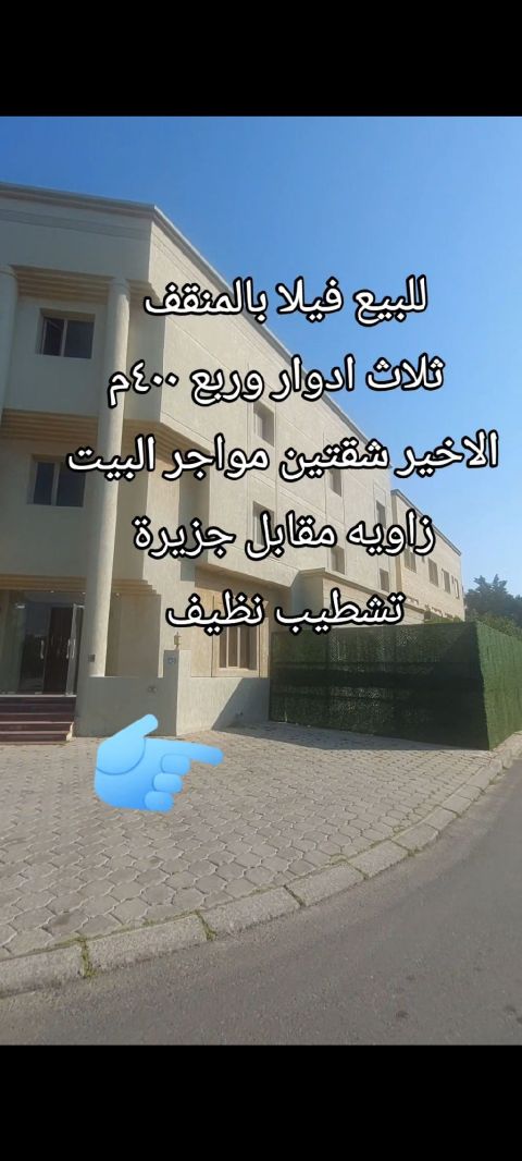 For sale, a villa in West Abdullah Al-Mubarak Al-Sabah, built in 2024, on a 400 square meter plot (front and back), opposite the mosque. Super deluxe construction consisting of a basement and 3.5 floors, each floor with four master bedrooms, a maid's room, guest washrooms, a large hall, a laundry room, a storage room, and a large kitchen. Total income is 3600, and the house is guaranteed. Selling price is 660,000.