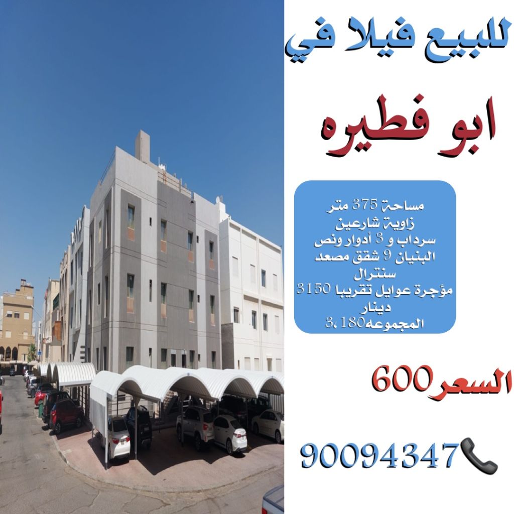 For sale, a villa in Abu Fatira with a land area of 375 square meters, located at the corner of two streets. It includes a basement, 3.5 floors, 9 apartments, a central elevator, and is rented to families. Price: 600,000 Kuwaiti dinars.