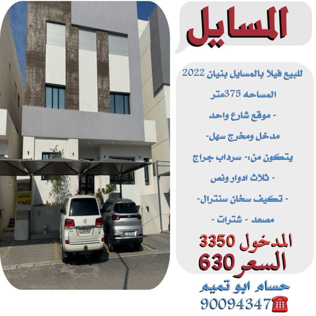 For sale, a villa in Al-Masayel, built in 2022, with an area of 375 square meters. It is located on a single street with easy access. It consists of a garage in the basement, three and a half floors, central air conditioning and heating, an elevator, curtains, and an income of 3350 Kuwaiti dinars. The price is 630,000 Kuwaiti dinars. Review is available.