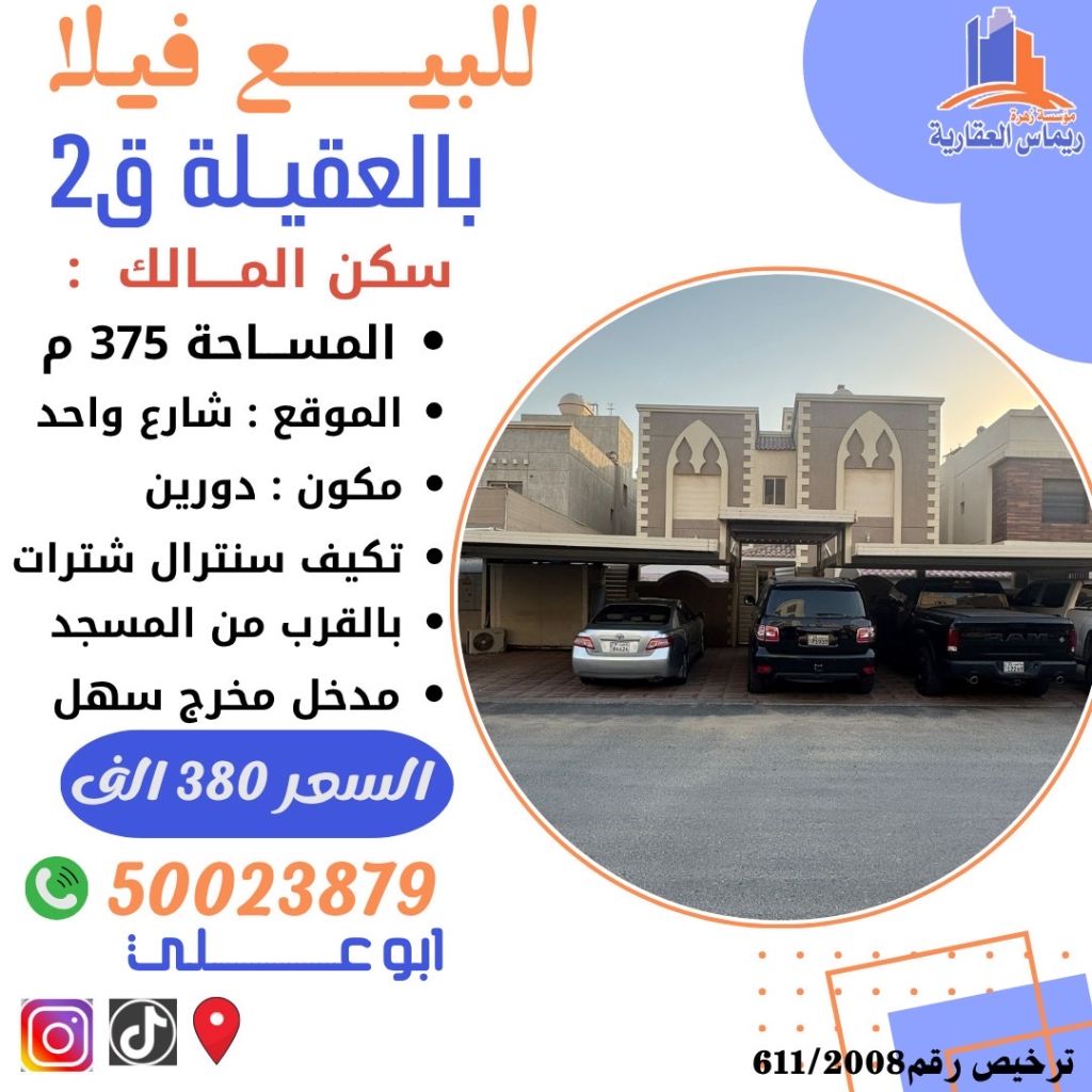 For sale: A villa in the Aqila area, with an area of 375 square meters, located on a single street, consisting of two units, with central air conditioning. The villa is very clean, owned by the resident, easy to access, close to services, and has easy entry and exit. Price: 380,000. The ground floor contains an external diwaniya and courtyard, a diwaniya with a bathroom and sinks, a hall with a bathroom and sinks, two rooms, a kitchen, and a maid's room. The first floor contains three master bedrooms, a hall, and a kitchen.